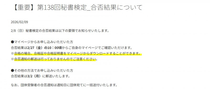 【秘書検定】第138回試験(2026年2月8日実施)の合否結果について